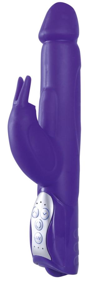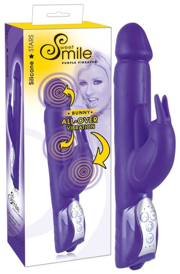 All-over vibrator with 7 vibration rhythms, 3 motors and bunny clit-tickler. 3 rotation levels. Purple. Length approx. 26 cm, Ø 3.7 cm. Material: silicone, ABS. Please order the batteries separately: 3 x Mignon (AA).