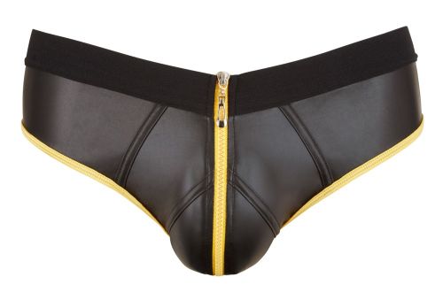 Slip in neoprene nero dall'effetto lucido con profili a contrasto in giallo. Fascia elastica in vita per un ottimo sostegno, zip sul davanti ed apertura intima sul retro... Uno slip dal design esclusivo e ricercato per sedurre con stile ed erotismo.