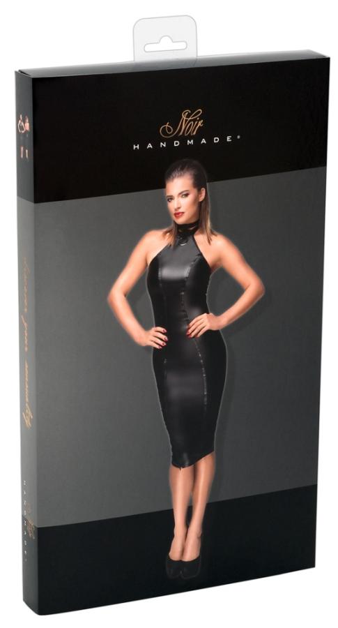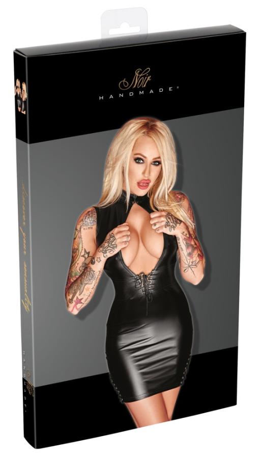 Mini dress nero molto sexy per donne dalle forme morbide, realizzato in similpelle e pizzo motivo floreale.