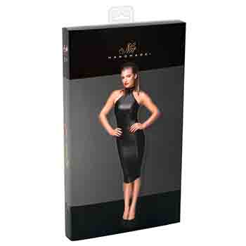 Tubino nero sotto ginocchio in similpelle con lunga zip posteriore e zip altezza coscia . Allaccio elastcizzato con chiusura a gancetti dietro al collo. Davanti è presente un anello in acciaio cromato da poter abbinare ai nostri guinzagli!
