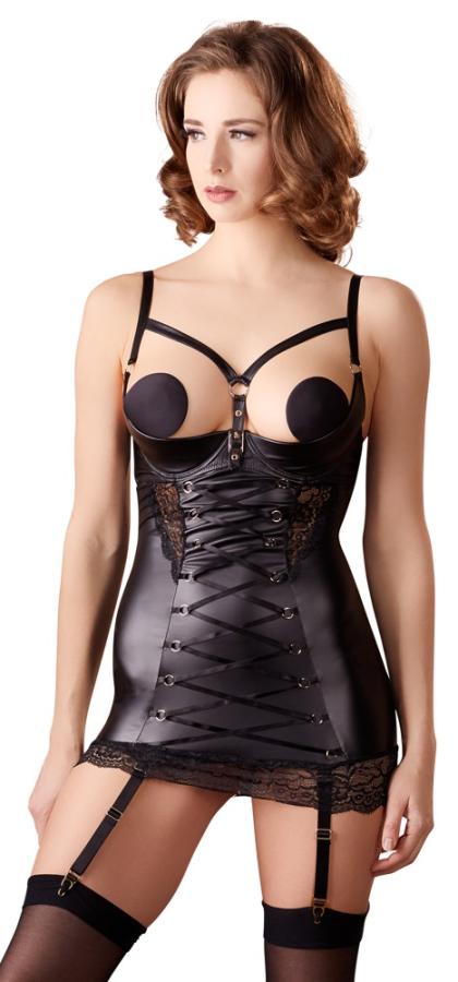 A beautiful outfit – thanks to the fancy details! The black lingerie dress is more than just an eye-catcher. The underwired shelf bra really emphasises your breasts because it has slightly padded cups and straps that go around your breasts. There is also decorative lacing at the front and lace inserts at either side of the dress – these two things combined can make your waist look smaller. The dress also has other details like a rhinestone ring at the front, a lace hem and gold-coloured decoration. The hook-fastener at the back, the adjustable bra straps and the adjustable and removable suspender straps make the dress comfortable to wear. Main material 90% polyester, 10% elastane; lace 90% polyamide, 10% elastane. Without stockings.