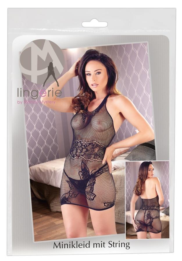 Incredibly sexy!This mini dress is fitted at the waist and has beautiful embroidery on the deep neckline. It also has wide, embroidered straps at the back and a convenient zip. Made out of semitransparent, striped net material with a sewed-on skirt part made out of stretchy power matte look.80% polyamide, 20% elastane; net material 92% polyamide, 8% elastane.IMPORTANT! There is a separate size chart for NOIR!