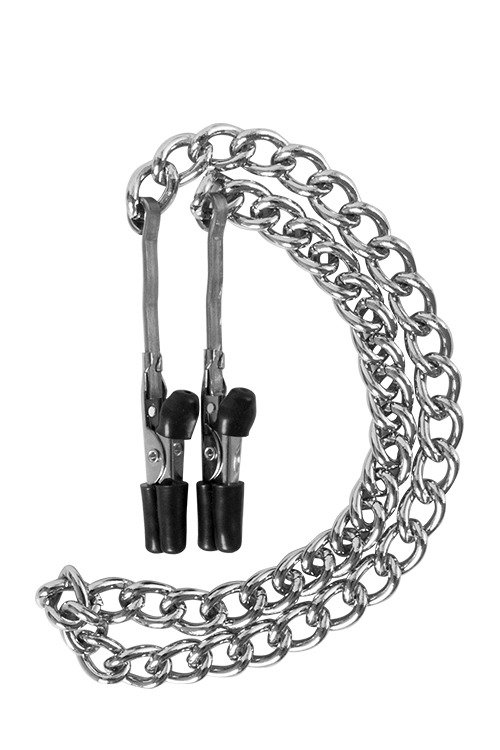 Set of 2 nipple squeezers.From the Guilty Pleasure BDSM collection.The Mini Munchers are made of metal and have PVC covers at the tips.The metal chain between the squeezers adds extra weight.Size of the squeezer tips: 1.1 cm / 0.4 inch.