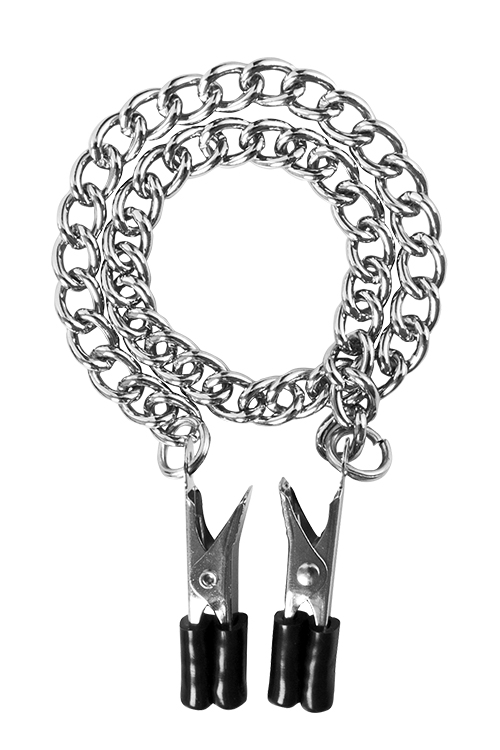 Set of 2 nipple erectors.From the Guilty Pleasure BDSM collection.\u00A0The squeezers are made of metal and have PVC covers at the tips.The metal chain between the squeezers adds extra weight.Size of the clamps: 4 cm / 1.5 inch.