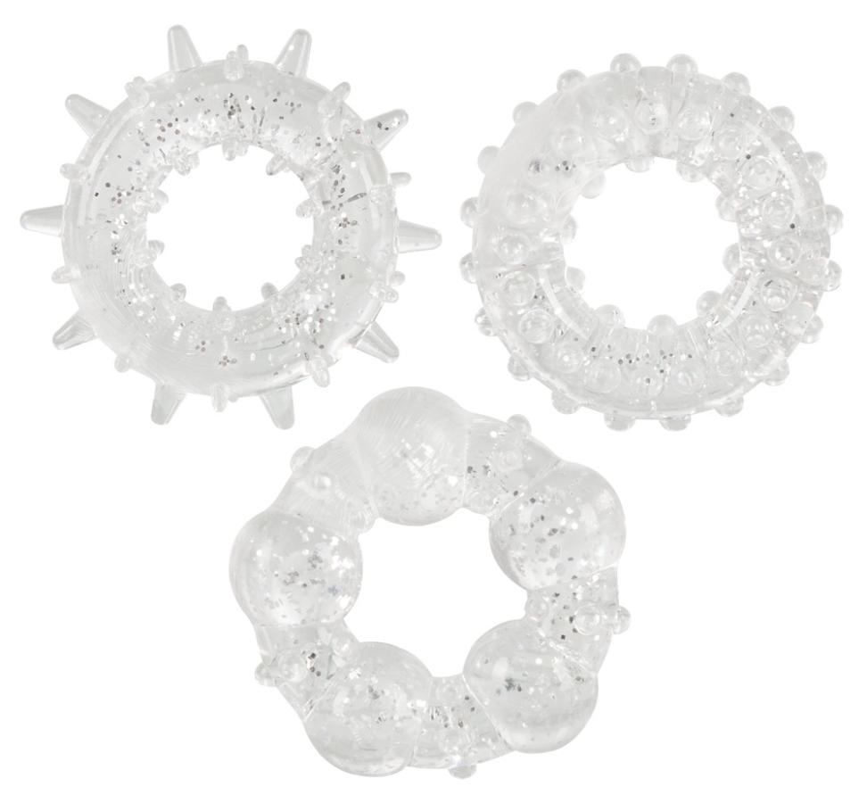 Tre anelli dai rilievi morbidi e dentati che sembrano decorazioni di cristallo! Ø ca. 1,5 cm (espandibile). Materiale: TPE.