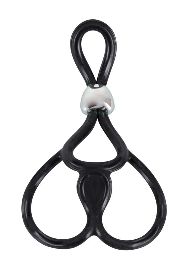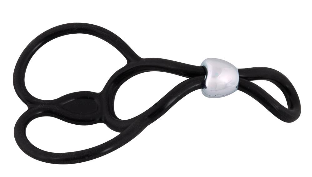 Uomo-o-uomo!Anello del pene con due anelli per testicoli (Ø circa 3 cm ciascuno, estensibile). Anello per il pene regolabile individualmente tramite perlina scorrevole. Lunghezza totale circa 13 cm. Nero. Silicone, ABS.