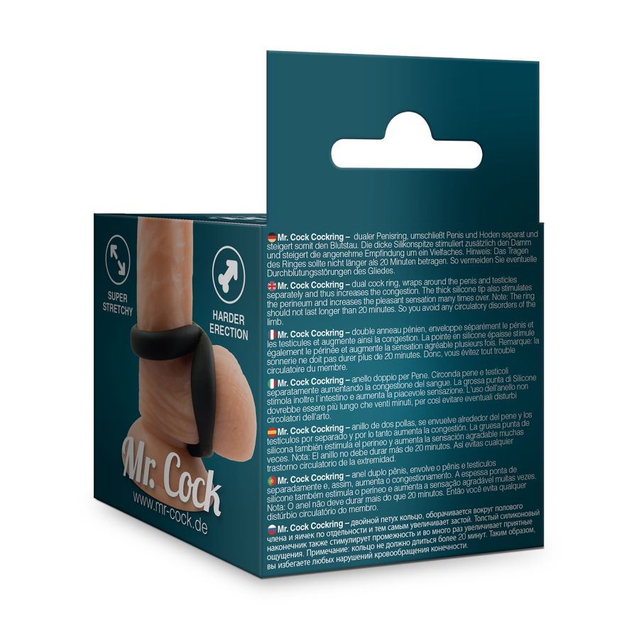 Mr. Cock Cockring - doppio anello, avvolge il pene e i testicoli separatamente e quindi aumenta la congestione. La spessa punta in silicone stimola anche il perineo e aumenta la piacevole sensazione.