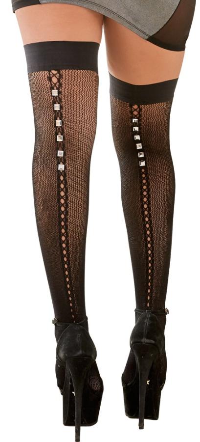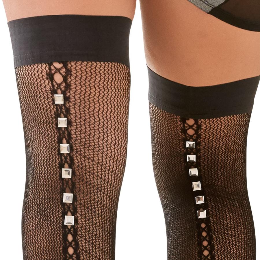 Hold up net stockings are perfect for erotic fantasies!These black hold up net stockings with a seam at the back will make these fantasies even more exciting! The “seam” is very sexy: extra large holes going all the way down the stockings are extremely eye-catching and they are topped off with square studs going up the thigh. They stay up on their own, thanks to the silicone strip around the top! 88% polyamide, 12% elastane.
