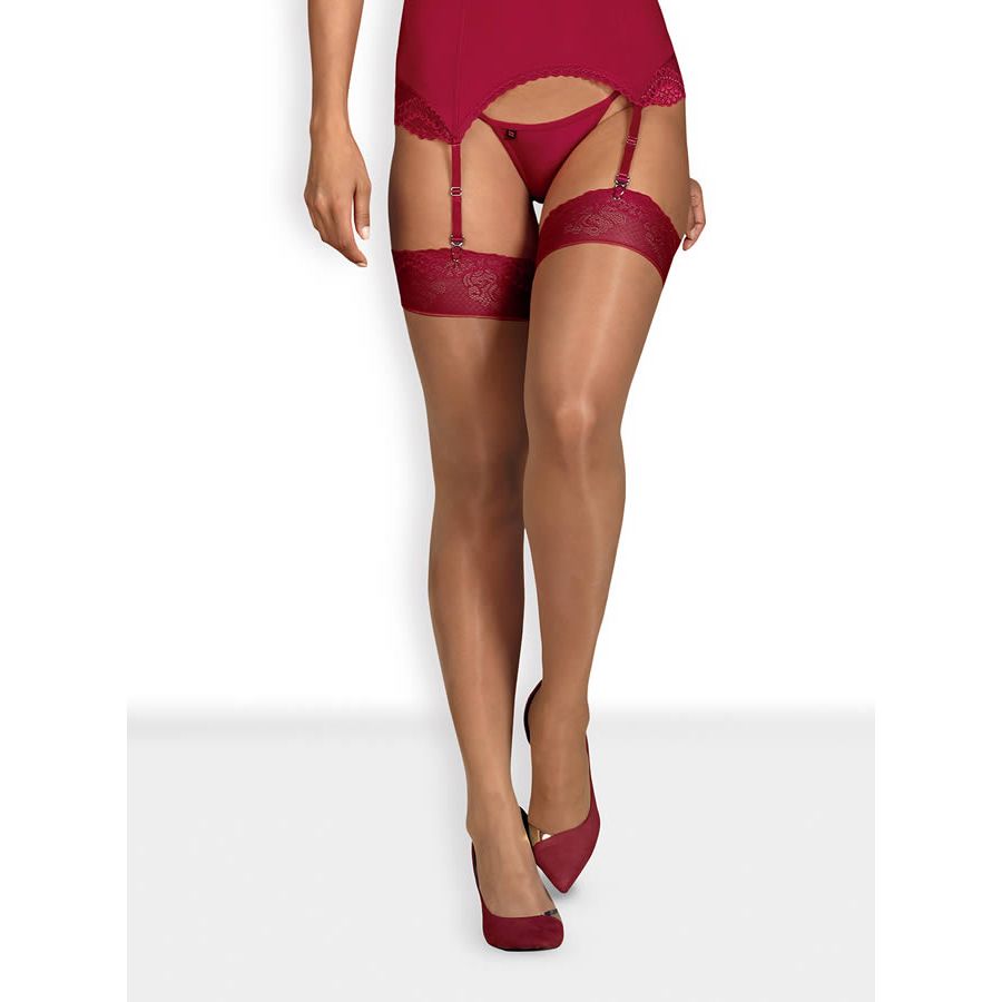 A suspender set with bondage accessories! A wireless bra with a 7 cm wide lace hem and cups that can be fastened and unfastened with the press studs. A wide suspender belt with a sewn-on crotchless string. The bra and 6 suspender straps are adjustable. The handcuffs and choker (both have hook and loop fasteners) are joined together by a removable metal chain (snap hooks). Black. 90% polyester, 10% elastane; lace 90% polyamide, 10% elastane. Without stockings.