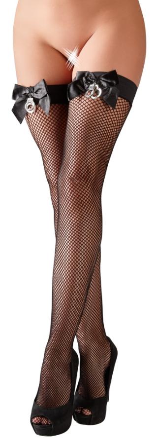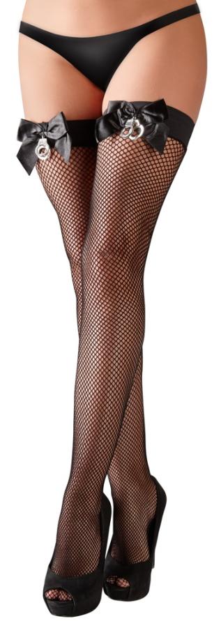 Captivating look!Black, coarse net, hold-up, stockings with a silicone strengthened top part, which is also decorated with a large bow and two thumb cuffs. 88% polyamide, 12% elastane.