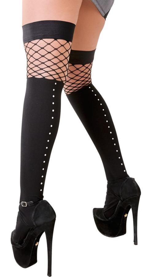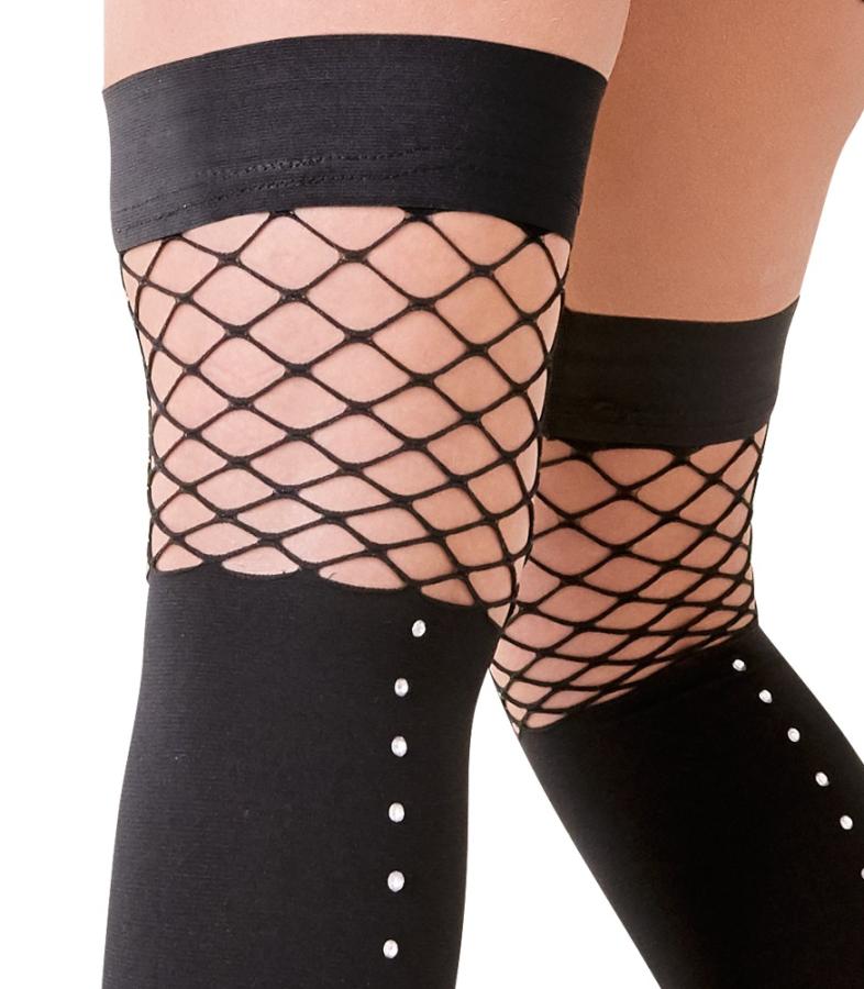 Thigh-high stockings with rhinestones for the seam. The top part is strengthened with silicone. Black. 88% polyamide, 12% elastane.
