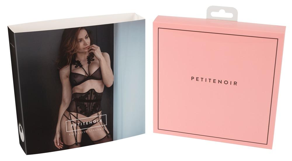 Even more sensual!The bodice made of transparent power net features bones and elastic, completely removable velvet straps in a extravagant and seductive design. The front is decorated with artfully made velvet and embroidery details. In the back there are hook and loop fasteners.93% polyamide, 7% elastane. Attention: Petitenoir has a separate size chart.