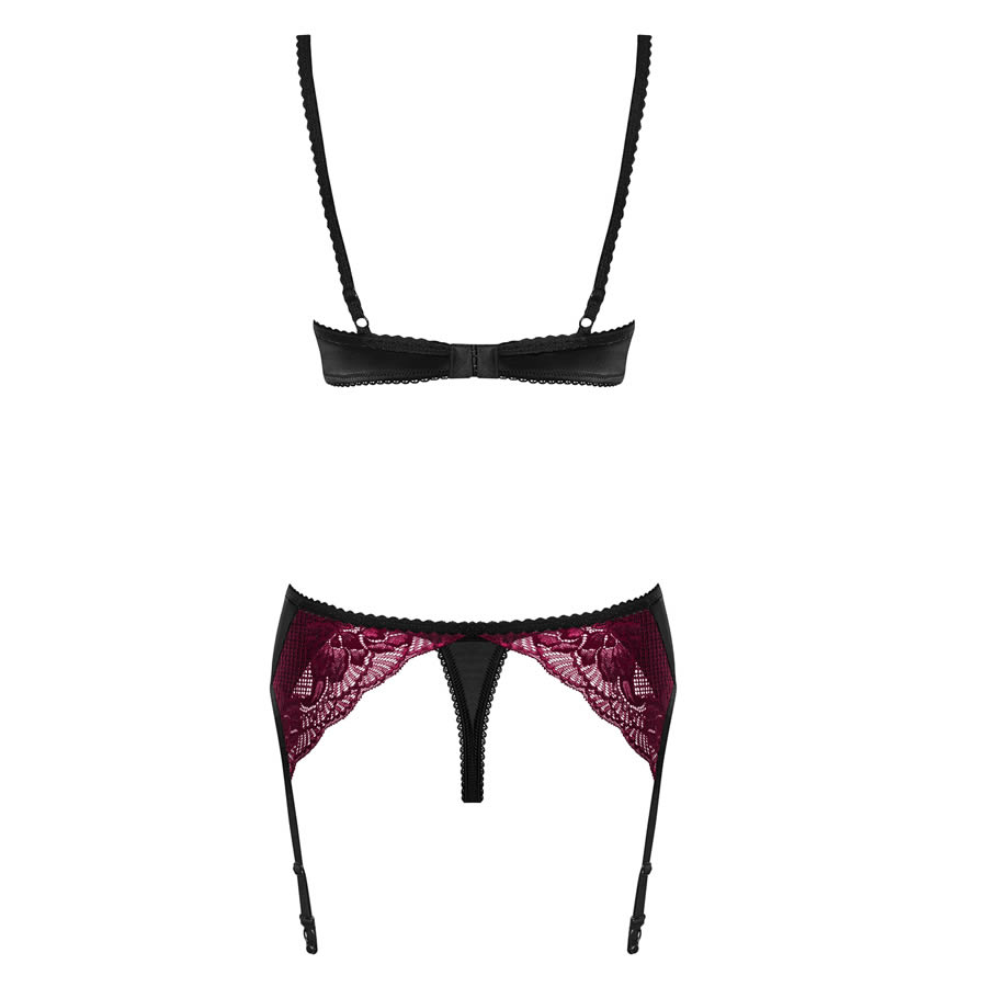 - three-piece set made out of glossy, black satin and amazing, burgundy lace