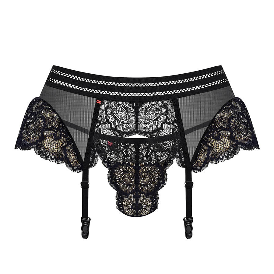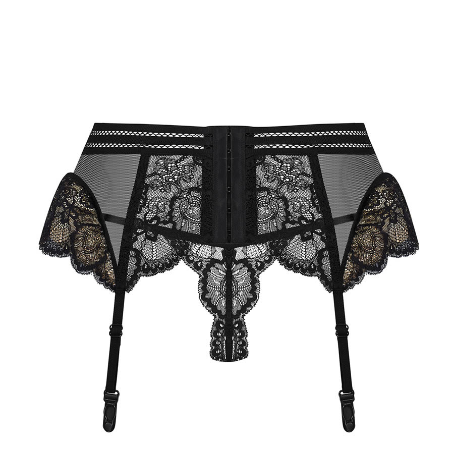 - garter belt made out of delicate, stretchable mesh and decorative lace with geometric motif