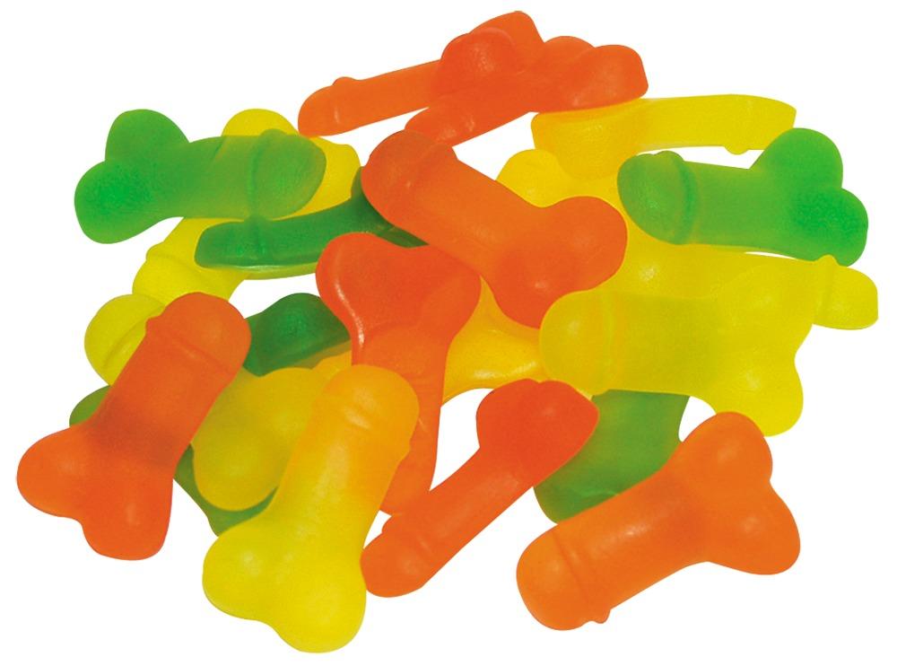 Caramelle alla frutta colorate a forma di pene. Scatola da 150 g.