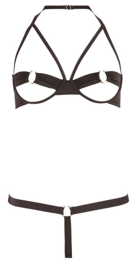 Pura seduzione!Questo set nero non lascia insoddisfatte le fantasie di nessun uomo! Il reggiseno con ferretto affascina con le coppe completamente aperte e gli anelli metallici a ferro di cavallo sui capezzoli. Con una pratica chiusura a gancio sul retro, il collo a cavezza alla moda può essere aperto comodamente con una chiusura a clip. Anche la corda affilata con elastico in vita e anello metallico sul davanti non è da deridere, in quanto solo una morbida fascia passa attraverso il cavallo. Con queste incantevoli vedute il tuo tesoro non riuscirà a tenere le dita ferme a lungo...Materiale: 85% poliammide, 15% elastan.