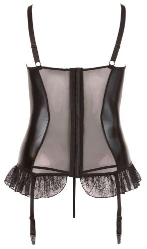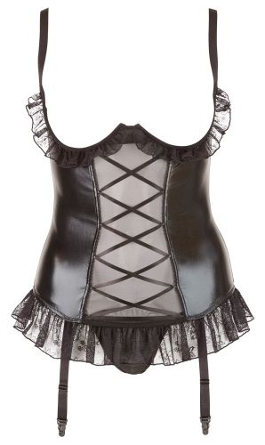 Basque è un corsetto in similpelle nero con giochi di trasparenze, merletti e voile francese, estremamente elegante ed eccitante. E' un corsetto wetlook per taglie importanti in similpelle nero, aperto con inserti powernet e pizzo. Le coppe reggiseno hanno il ferretto e presentano un allacciatura anteriore, chiusura a gancetto sul retro e bretelle regolabili. Di colore nero è realizzato in materiale di qualità. Include una stringa ed è senza calze.