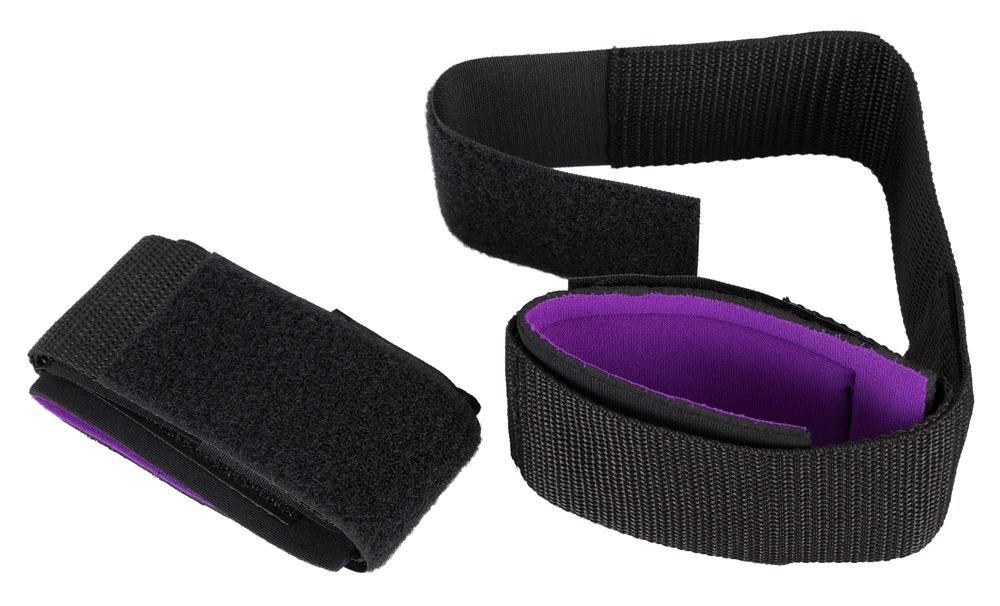 Rende indifesi per raffinati giochi erotici. Manicotti per cosce morbidamente imbottiti (lunghi ca. 58 cm ) con manicotti per polsi saldamente fissati (lunghi ca. 30 cm ). Chiusura a velcro. Nero/viola. 100% poliammide.