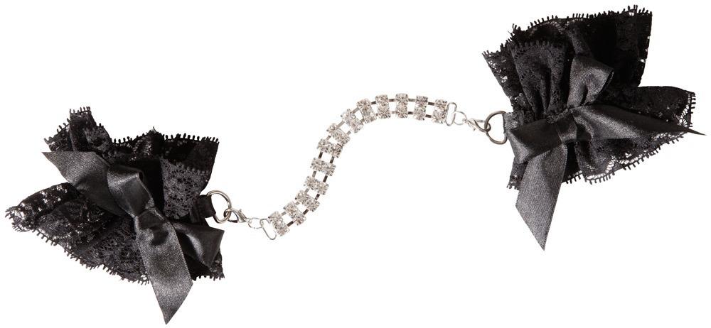 Lace handcuffs with satin ribbons and bow decoration. The chain part has a snap hook at each end and is decorated with luxurious rhinestones. Black. 100% polyamide.