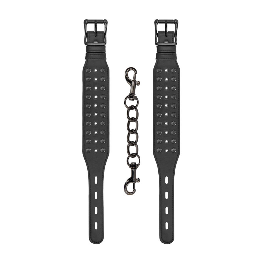 Con due file di stupendi spuntoni, una fibbia singola su ogni manetta e un collegamento resistente e staccabile in metallo, questo giocattolo indica che fai le cose seriamente. Realizzate in similpelle nera di alta qualità e in metallo grigio scuro, queste Cavigliere con Spuntoni fanno sempre il loro lavoro!