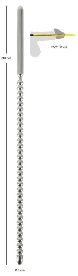 dilatatore uretrale...a forma di sfera irritante con punta arrotondata, manico liscio e punta per un facile inserimento. Prodotto senza soluzione di continuità. Lunghezza totale circa 24 cm. Asta di inserimento lunga 17,5 cm. Ø ca. 6 mm. Materiale: acciaio inossidabile.