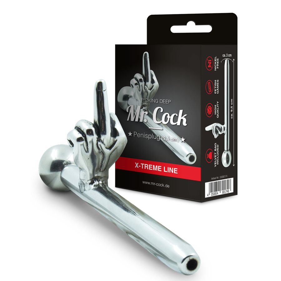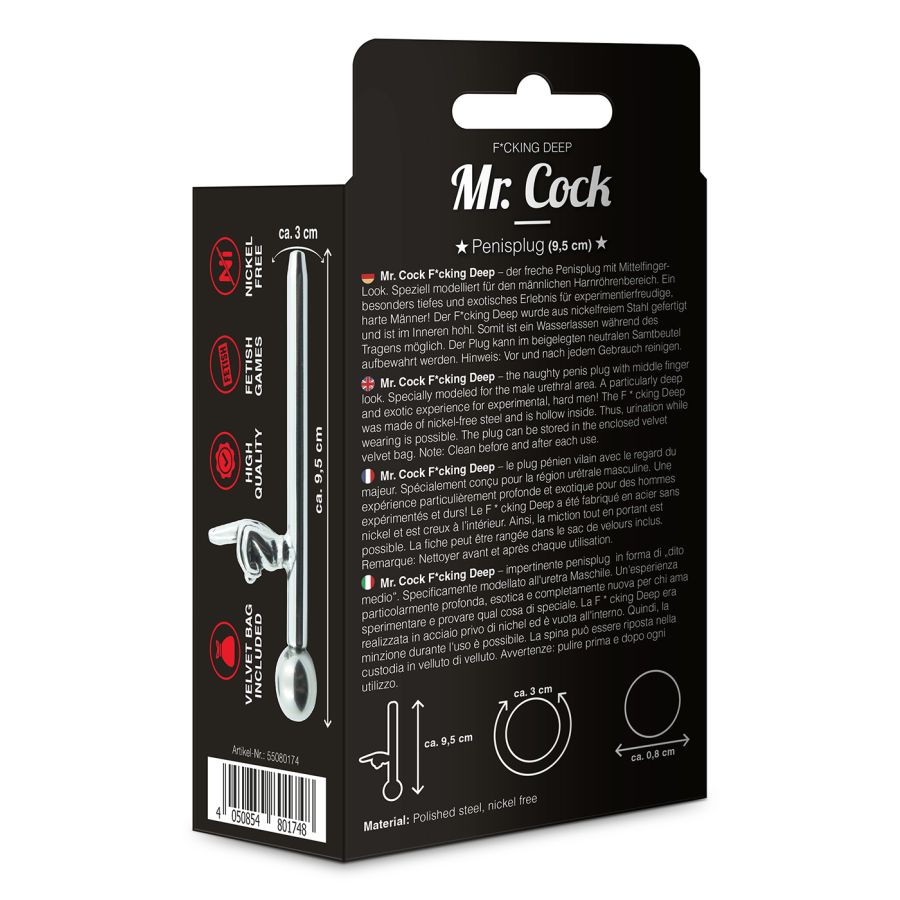 Mr. Cock F*cking Deep - Il plug per il pene con il look del dito medio. Modellato appositamente per l'area uretrale maschile. Un'esperienza particolarmente profonda ed esotica per uomini che vogliono provare un'esperienza diversa! F*cking Deep è stato realizzato in acciaio privo di nichel ed è cavo all'interno. Pertanto, la minzione durante l'uso è possibile. La spina può essere riposta nella custodia in velluto inclusa.