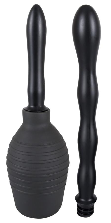 Per il piacere intimo degli schizzi!Doccia intima nera (altezza 13 cm, capacità 300 ml) con due attacchi intercambiabili a vite con ugelli a spruzzo. Facile da pulire. Attacco lungo e ondulato: lunghezza totale ca. 23 cm, Ø 1,7-3 cm. Attacco corto e liscio: ca. 11,5 cm di lunghezza Ø 1,9-2,3 cm). Materiale: PVC.