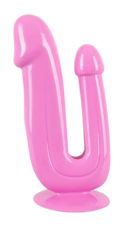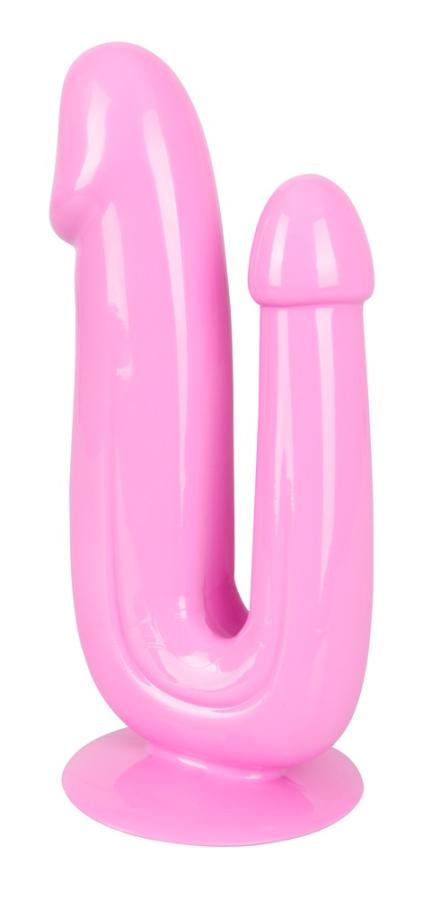 Double penetration!Pink double dildo with a handy suction cup. The vaginal arm has slight glans and the anal arm has a rounded head. The slightly flat dildo is extremely fulfilling, very flexible and has a stimulating groove on the shaft. Complete length 17.5 cm, insertion depth 13.5 cm (vaginal arm), 10 cm (anal arm), Ø max. 4.2 cm (vaginal arm), max. 2.8 cm (anal arm). PVC.