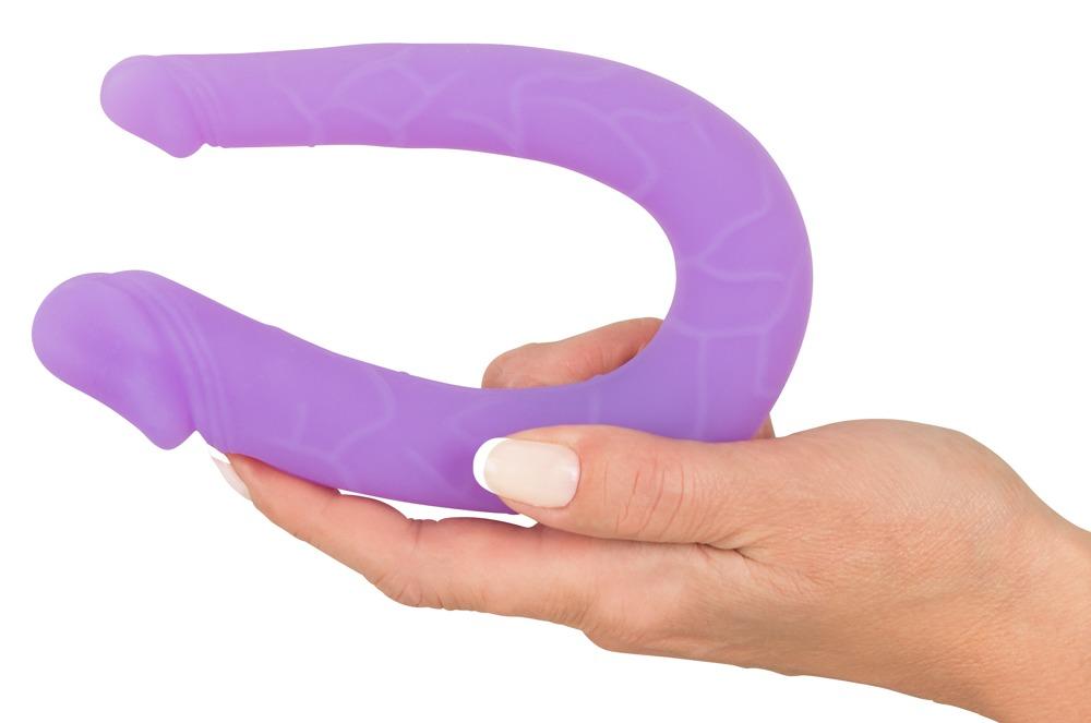 Enjoy simultaneous vaginal and anal penetration! Flexible double dildo with veins, a velvety soft surface and bulging glans at either end. Size: 15 cm long, Ø 2.6-3.5 cm. 14 cm long, Ø 1.7-2.4 cm. Material: silicone with a PU coating.