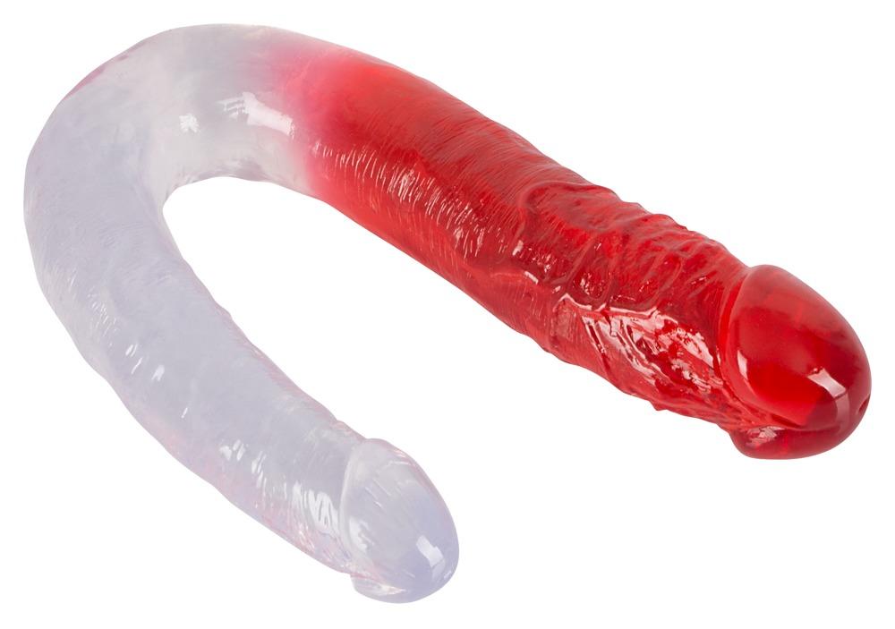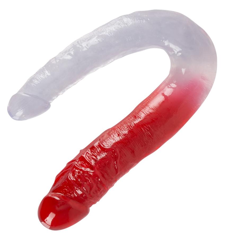 Per il piacere solitario o giochi di coppia!Bellissimo dildo flessibile doppio in look pene con ghianda ad ogni estremità. Lunghezza totale 32 cm, Ø 3,1 (dildo trasparente) a 4,3 cm (dildo rosso).PVC.