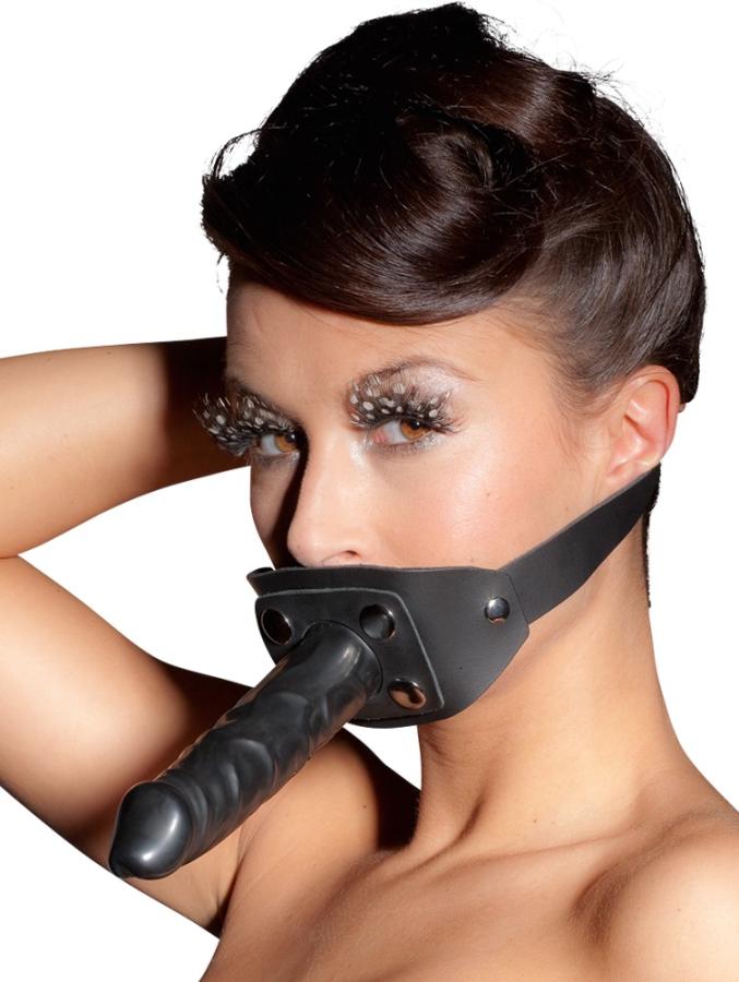 Cinghia in pelle crosta regolabile, nera, internamente con mordaccia, esternamente con fallo. Fallo di lattice 13 cm di lunghezza, mordaccia di lattice lunga 6 cm, entrambi Ø 3,5 cm. Prodotto utilizzando lattice di caucciù naturale che può causare allergi