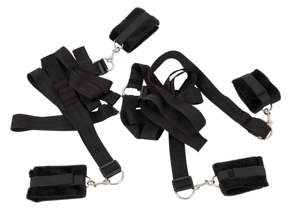 Ti piace il bondage erotico?Allora questo set da letto è un must-have per voi! Quattro cinghie con moschettoni ad ogni estremità sono collegate da una barra di collegamento sotto il materasso. Regolate i polsini di peluche individualmente ai polsi e alle caviglie del vostro partner con il velcro e agganciateli ai moschettoni. Costretto a rimanere immobile, il vostro partner ora giace sul letto di fronte a voi con braccia e gambe divaricate... Ora è nelle vostre mani per portare la persona o le persone legate al climax esplosivo!Dimensioni: barra lunga max. 145 cm, allacciatura alla caviglia lunga max. 140 cm ciascuna, polsini di peluche max. Ø 8,5 cm. Tutti regolabili.Materiale: poliammide (cinghie), poliuretano (polsini per le mani e le caviglie), metallo cromato.
