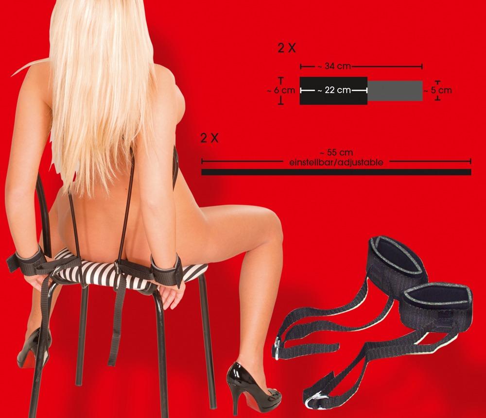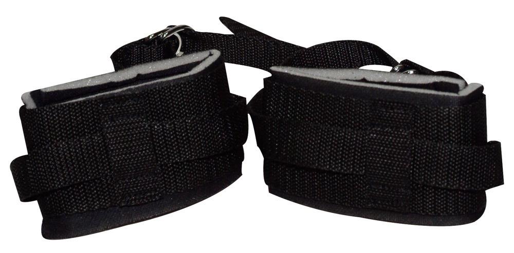 Due manicotti per i polsi imbottiti con chiusure a velcro per mani e piedi. Con i nastri regolabili in lunghezza fissati, potete legare la vostra „vittima“ quasi ovunque. Neri e a prova di strappo. Materiale: poliammide, espanso.