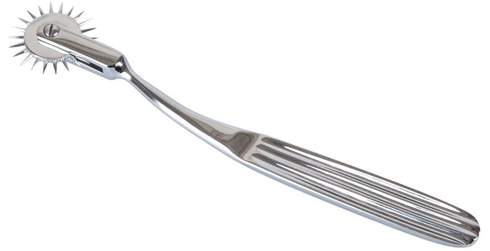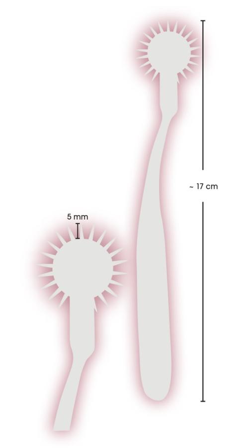 Girandola metallica color argento con punte di ago lunghe 5 mm e impugnatura. Complessivamente 18 cm di lunghezza. Materiale: ottone cromato.