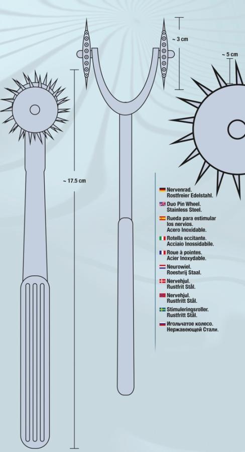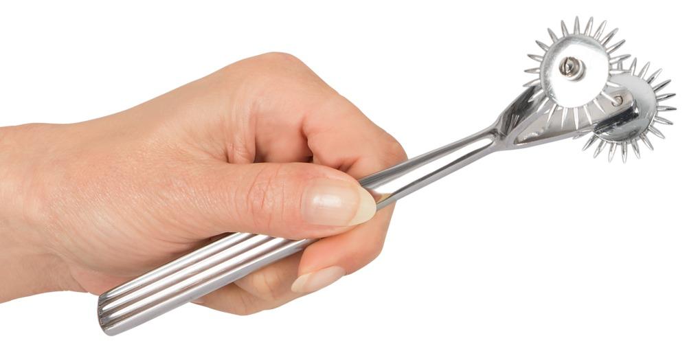 Thrilling pain!Double pinwheel with pointy spikes and a handle. Silver-coloured. Complete length 17.5 cm, spikes 0.5 cm long, distance between the two wheels 3 cm. Stainless steel.