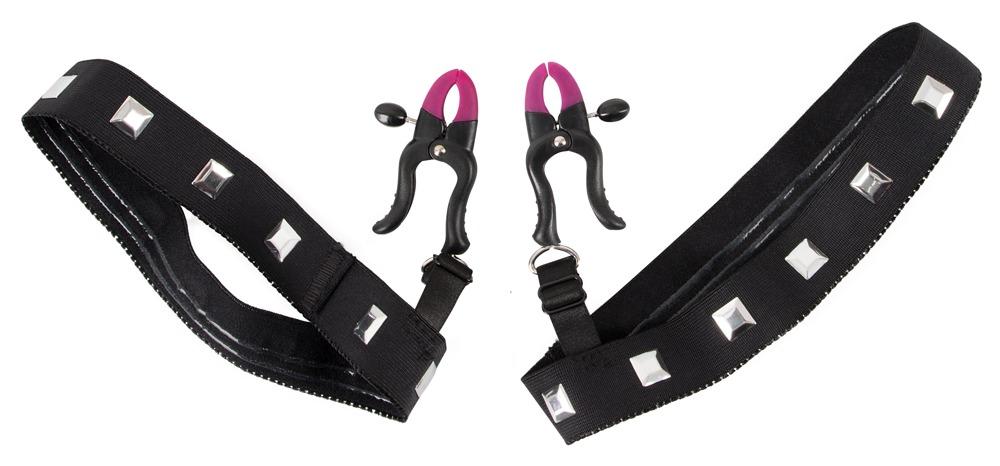 Garters with labia clampsThe garters are lined with rubber and decorated with silver-coloured, square-shaped metal pieces. The 2 labia clamps attached to the garters can be adjusted separately. Black/pink/silver-coloured. Circumference of the garters: 38 cm (slightly flexible). Clamp length: 6 cm, elastic band attached to clamp: 4 cm. Material: polyamide, elastane, aluminium, iron, carbon steel, PC plastic, silicone strap: 85% polyamide, 15% elastane.