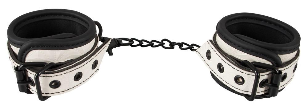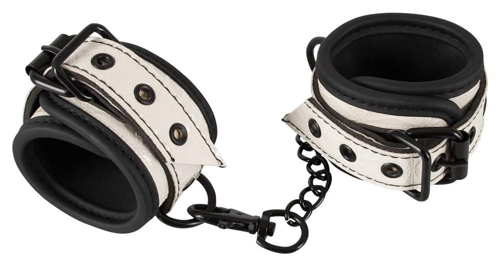 Soprattutto nel design e nel colore!Un paio di manette bianche con una speciale struttura superficiale ""taglio a diamante"" e contrasti neri. I polsini sono leggermente imbottiti e si adattano a quasi tutti i polsi grazie alla chiusura con fibbia regolabile multipla. 27,5 cm di lunghezza, 5,5 cm di larghezza. La catena di collegamento con moschettone è lunga 15 cm e quindi limita notevolmente la libertà di movimento della persona legata.Materiale: poliuretano, metallo, gomma sintetica.