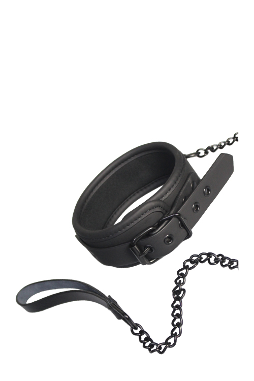 Durable neoprene collar. The all black hardware is nickel free. Fully adjustable with the simple, belt style buckle and connected to a removable black chain. This black Collar & Leash set has all black nickel free hardware and is lined in a soft yet durable neoprene material for sexy and comfortable play. It is easy to adjust in size thanks to the buckle closure. The black metal leash with attached wrist loop can easily be connected or disconnected with the musketon clip.
