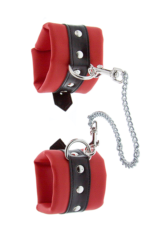 Manette da polso in ecopelle con fibbia e catena di metallo.