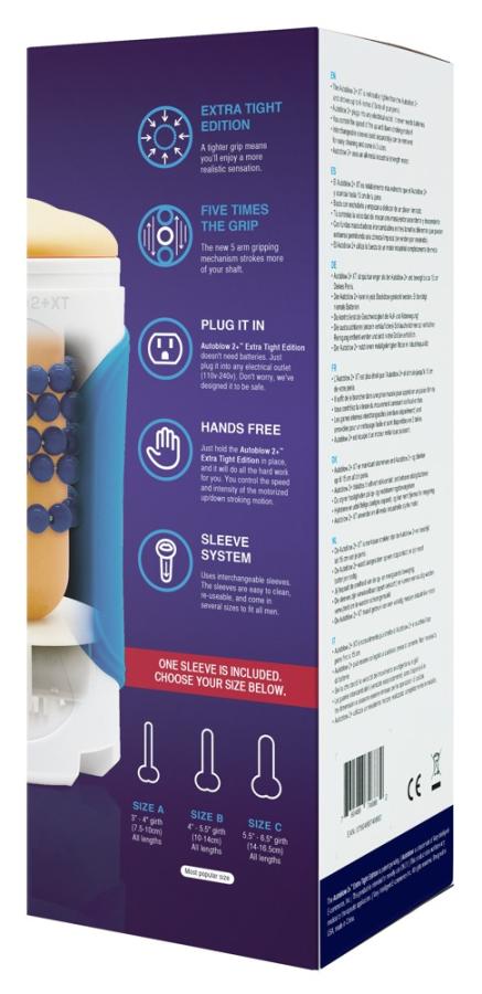 Luxury Blow Job machine for sophisticated men – now in an Extra Tight Edition!There is a motor inside the robust casing, which rhythmically moves the springs up and down. The penis sleeve is inserted into the casing so that the springs are around the sleeve (A: for a penis circumference of 7.5 to 10 cm, B: 10 to 14 cm, C: 14 to 16 cm, sleeves suitable for all lengths).What it has to offer:1. Very powerful & robust industry quality motor2. Multi-speed up and down movement3. Hands-free stimulation4. Realistic sleeve material5. Plug connectionMaterial: TPE, ABS.Please note: it is recommended to use lubricant when inserting the penis into the sleeve.Please note: the Autoblow automatically turns itself off when it gets too hot or there is too much pressure.