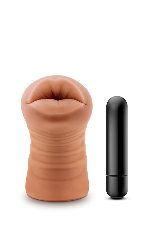 Soft & supple masturbator. Textured love canal. Open-ended. Includes vibrating bullet. Waterproof. Requires 1x AAA battery, not included.