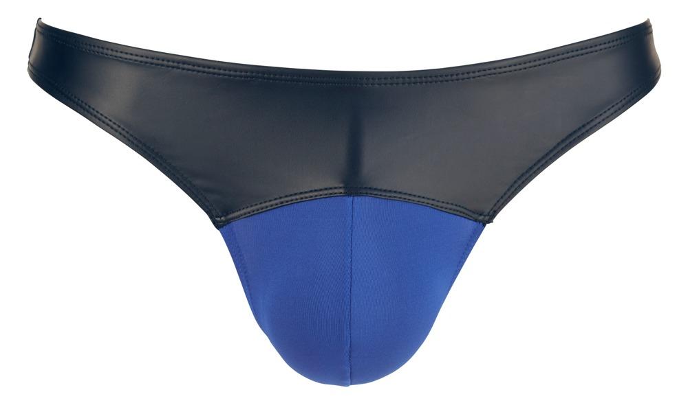 Royal blue string with fancy details!Fine string with matte black, fabric-covered straps at the sides that run together to a wide waistband at the front. The royal blue pouch, made out of soft microfibre, emphasizes the erotic appearance.60% polyurethane, 36% polyester, 4% elastane. Pouch: 90% polyester, 10% elastane.