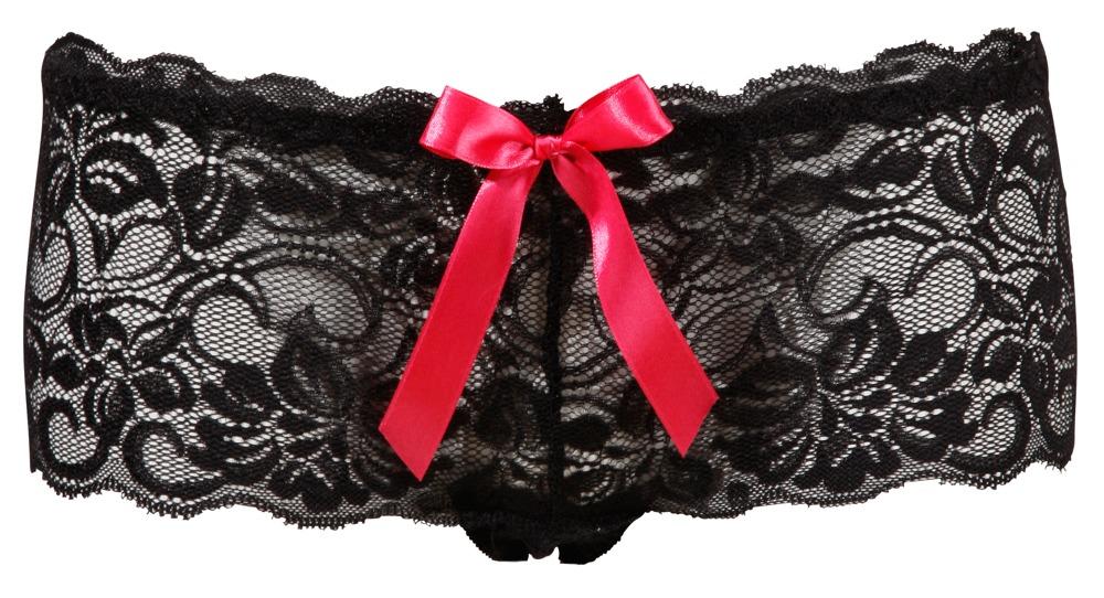 Hot and sexy!Tight-fitting, black lace panties with a decorative pink bow at the front and the back. Crotchless. 94% polyamide, 6% polyester.