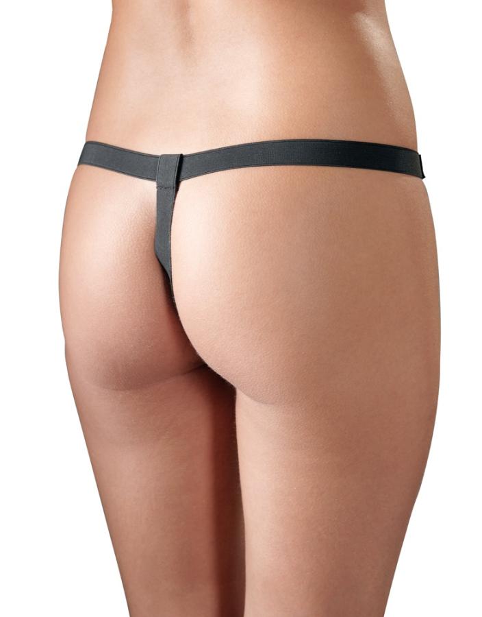 Small seductress!Soft, black imitation leather string with gold-coloured cord and ring at the front. Small bag inside (approx. 6 x 4 cm) for e.g. a vibro-bullet. 100% polyurethane.