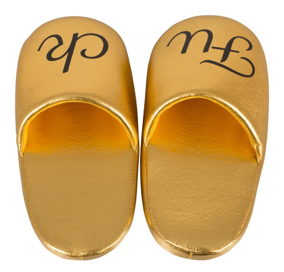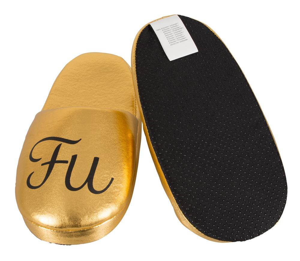 Exciting and provocative slippers! Soft, gold-coloured slippers with black text! The right slipper has ""FU"" on it and the left slipper has ""CK"" on it, so when the slippers are next to each other they spell ""FUCK""! One size: approx. 37 to 43 (German shoe size). Material: cover 100% polyester, lining 100% polypropylene.