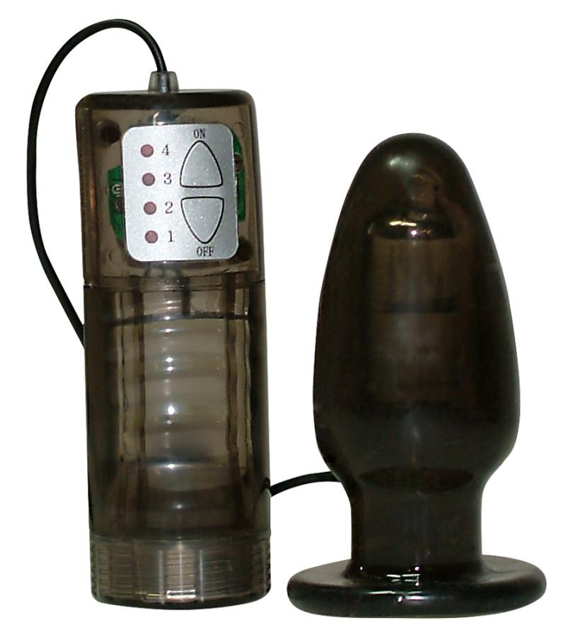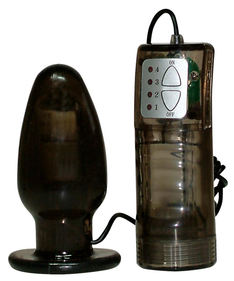 Plug vibrante nero trasparente con piede a ventosa. Ca. 9,5 cm di lunghezza, Ø 2-4 cm. Vibrazione a 4 livelli regolabili con pulsante. Materiale: TPE.