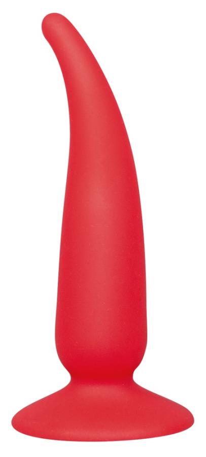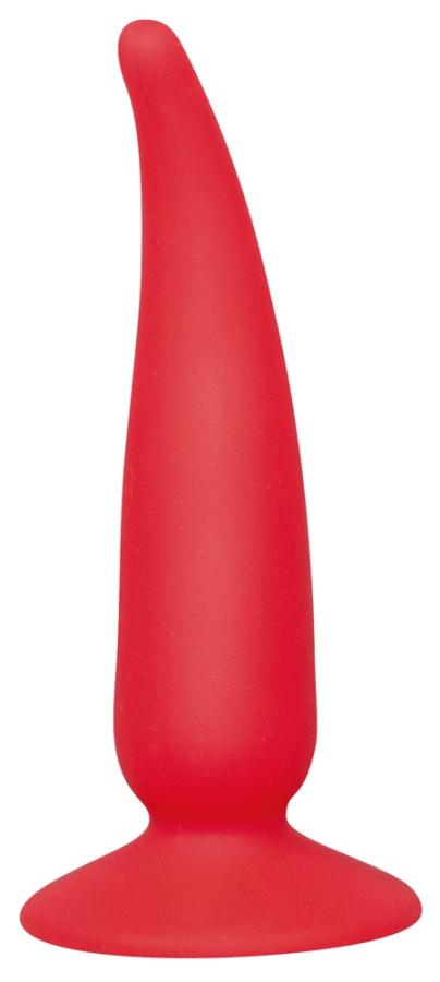 Red anal plug with a tapered tip for easy penetration and a suction cup base to keep it in place while playing hard. Full size: 13 cm. Penetration depth: 11 cm, 1-2.7 cm diameter. Material: silicone.