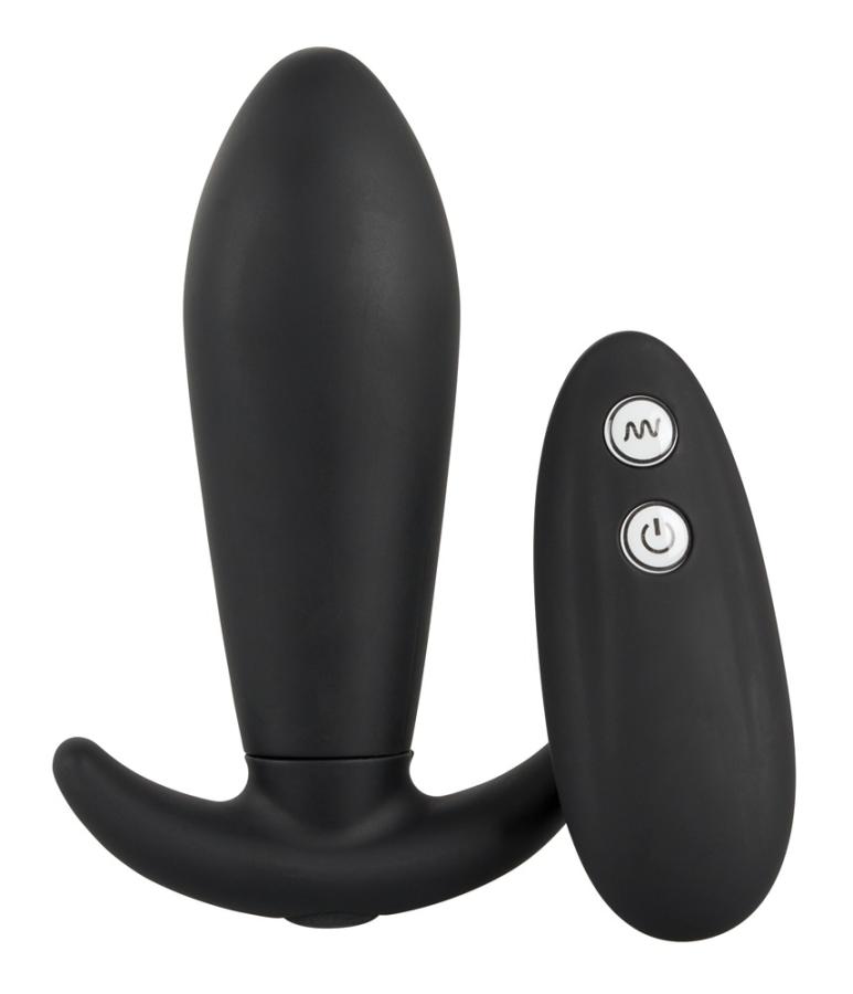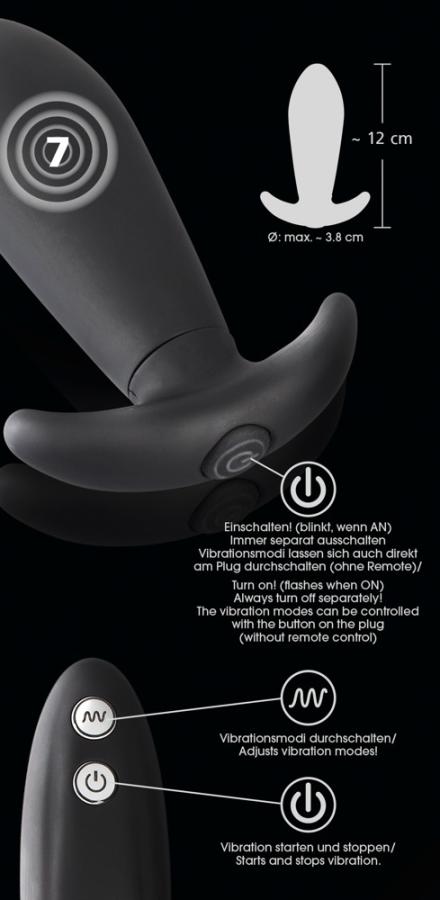 Anal pleasure at the push of a button!Get this black vibro-plug and treat your backside to exciting vibrations. The plug slides in almost on its own, thanks to its cone shape and velvety soft surface. The anchor shaped base makes sure that the plug stays in place so that it can stimulate you with its 7 different vibration modes. Use the button on the plug or the included remote control to adjust the vibrations OR give your partner the controls and let them surprise you with the vibrations… Complete length 12 cm, Ø 3.8 cm. Material: ABS with a polyurethane coating. Includes batteries.