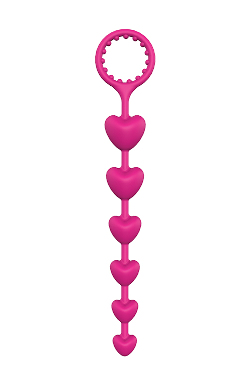 Anal beads for extra stimulation during foreplay or climax. O-ring for easy withdrawing.A very flexible anal cord made of body safe silicone, with 6 heart shaped beads, small at the top and gradually increasing in size towards the base of the cord. The Heart Beads has an O-ring for easy withdrawing, that can also be used as a penis ring because of the stimulation nubs inside the ring. A toy like this is great for anal play and can provide extra stimulation during foreplay or during the climax. It is suited for both men and women. The beaded shape of the toy and the heart shaped beads both result in very exciting sensations while inserting or withdrawing. Do it slowly and carefully, bead by bead. How far can you handle it? Diameters of the ringed beads: 1.6 \u2013 1.8 \u2013 2.0 \u2013 2.2 - 2.6 \u2013 2.8 cm. Total length of the toy: 23 cm. Insertable length: 18 cm.Wash with soap and water before and after each use.