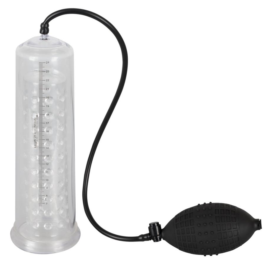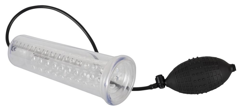 For pleasurable potency training!Transparent penis pump with a knobbed inner sleeve (Ø 4.5 cm flexible, length approx. 20 cm) and handy pump ball. You can see the success of how much your penis has increased by with the scale. With a safety pressure valve. Cylinder approx. 25 cm long. Material: ABS, TPE (sleeve), PVC (pump ball).